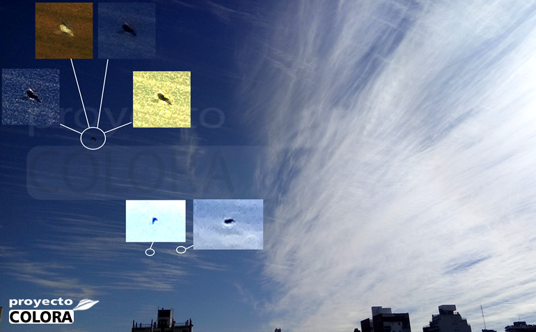 El dia miercoles 6 de Julio de este año a las 14,30hs Claudio Bios, salió al balcón, y al mirar el cielo le llamó la atención ver las nubes muy bonitas como si estuvieran peinadas, y le sacó una fotografía, horas màs tarde al observar la foto que habìa tomado, observa unas formas oscuras flotando en el aire.-