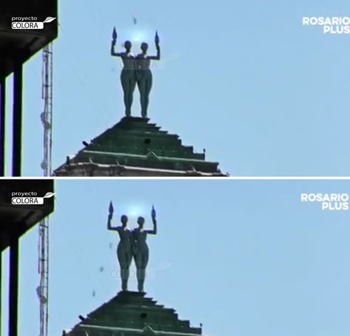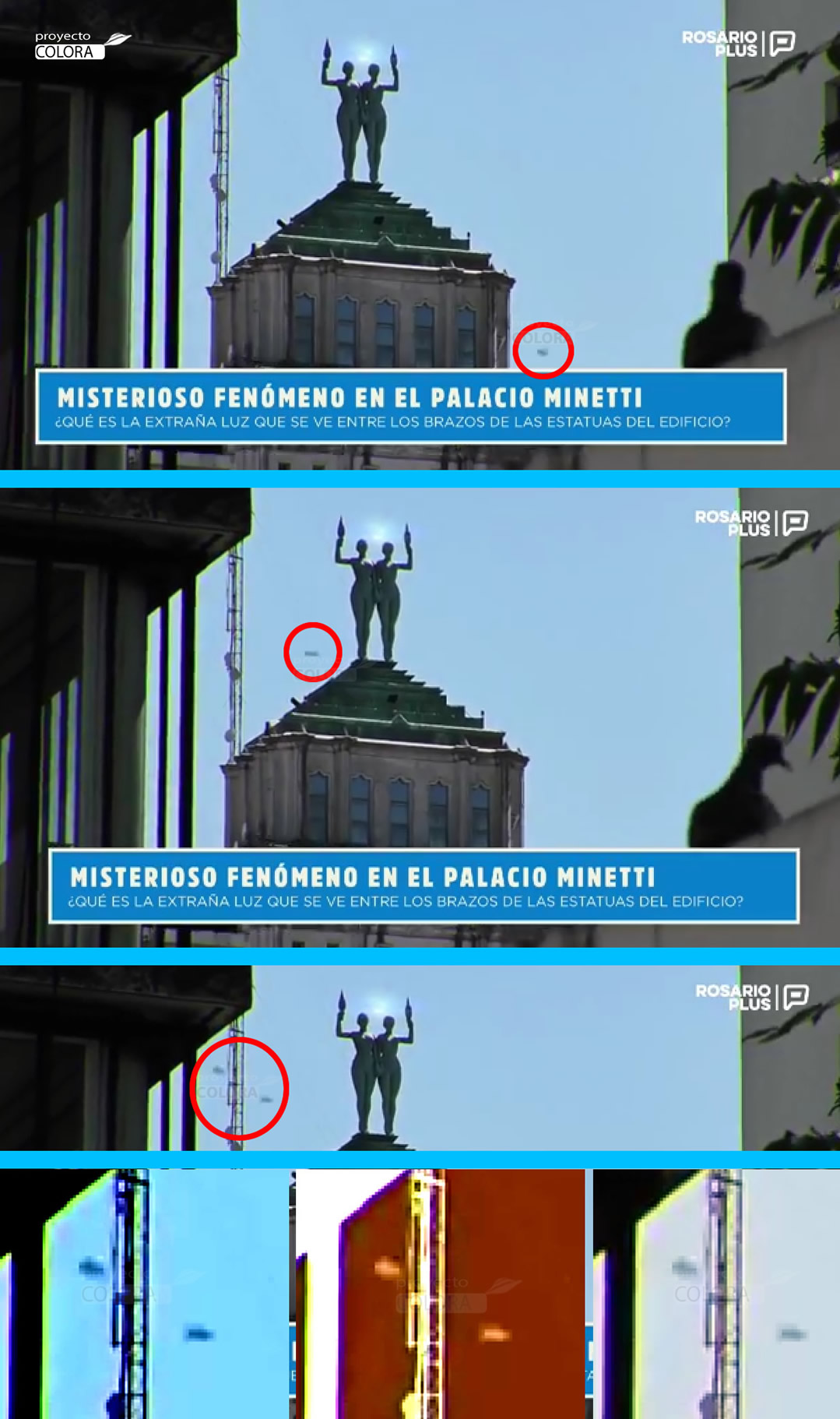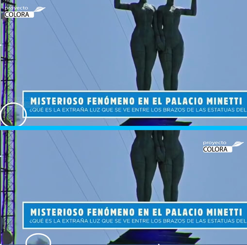 Una verdadera rareza se pudo divisar este jueves al mediodía en el cielo que bordea al Palacio Minetti, edificio emblemático de la peatonal Córdoba. Se trató de una extraña luz ubicada justo entre los brazos de las estatuas que vigilan desde lo alto. El fenómeno fue derecho a los R-Files, que busca explicarlo todo, hasta lo que no tiene explicación.( Fuente ROSARIO PLUS).