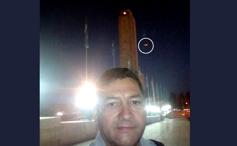 Estaba paseando en el Monumento a la bandera, lo hago muy a menudo , estaba retirándome del lugar rumbo a mi casa, cuando en un momento sentí el deseo de sacarme una selfie, me auto fotografié, al mirar la foto me sorprendí por lo que estaba a mis espaldas, era un Plato Volador!, inmediatamente me di vuelta para verlo con mis ojos, pero no se veía nada. Como investigador del fenómeno Ovni me di cuenta que este es uno de los casos en que nuestros ojos no pueden ver ciertos objetos que están en los cielos. Conclusión del caso: El señor Rene Capdevila, se da cuenta de la existencia del ovni cuando revisa la fotografía sacar el mismo, el formato de esta nave es de tecnología desconocida por la ciencia terrestre por lo que se considera una Nave Alienígena. El hecho sucede en el Monumento a la Bandera, lugar donde se avistan con mucha frecuencia Naves de todo tipo,lugar donde está anclado el Epicentro de la Elipse conformada por varios vórtices energéticos de la Región, (Teoria Rosario Epicentro de Portales Interdimensionales).