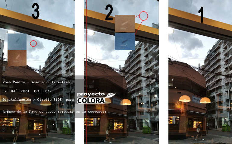 El testigo Sra. Claudio, la tarde del Domingo 17 de Marzo de 2024, a las 19Hs. pm. Le llama la atención una antena camuflada dentro de un cilindro, procede a tomar 3 fotos que pueden apreciarse con número 1,2 y 3. Permanecieron esas fotos varios días en su celular, cuando decide borrarlas, antes, las amplía, y descubre para su asombro un objeto en forma de cilindro , en 2 de las fotos ( Fotos números 2 y 3 ) y las envía para ser analizadas.