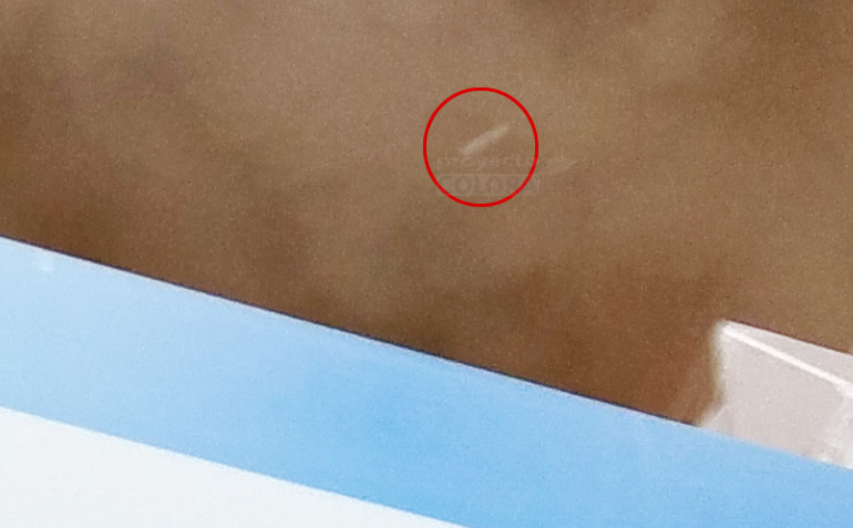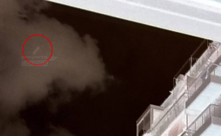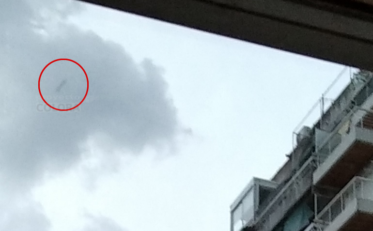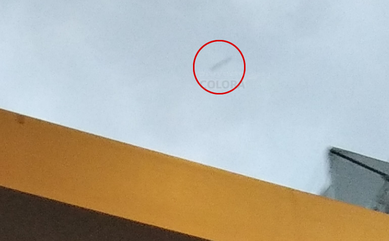 En las fotos de observa un objeto en forma de cilindro, color oscuro, no visualizado en ese momento de obtener las fotos por el testigo. Ha pasado a alta velocidad, siguiendo una trayectoria SurOeste a NorEste.Descartamos que haya sido un dron , por la gran velocidad ,no captada por la vista y sin emitir ruido al pasar por el área.