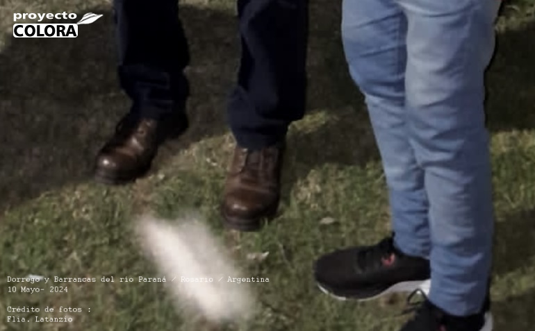 Siguiendo en observación nocturna, el señor Agustín Latanzio fotografiándose con el investigador y contactado Dante Franch, se puede apreciar en el césped y delante de sus pies aparece un objeto con forma de tubo luminoso desplegando energía blanca en unos 10cm, de largo aproximadamente. Es muy probable que estemos ante un censor de alguna de las tantas naves que han visitado esa noche.