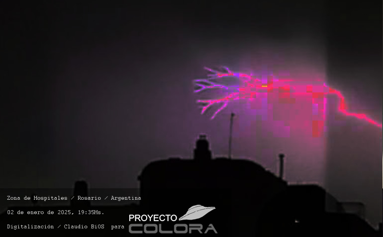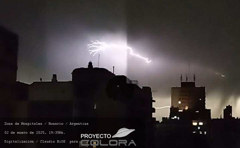 Las fotografías fueron estudiadas con riguroso criterio y tecnología adaptada a la documentación. Se puede observar un canal energético de diámetro muy amplio uniendo desde las alturas de los edificios hacia el cielo sin poder detectar su límite. En el interior del canal se producen o proyectan ramificaciones de rayos que luego se unen formando solo uno, este rayo, al salir de los límites del canal, desaparece y se puede observar un ovni secundado de una luz poco visible. Cabe destacar que en el cielo se puede ver una gran nube espesa y oscura, y hacia el horizonte se vislumbra un cielo limpio con luz solar. Se trata de la apertura de un Portal creado posiblemente por una nave suspendida, camuflada en la nube muy densa ocacionando oscuridad a todo el sector de la zona y propiciando la salida del Ovni anteriormente mencionado.